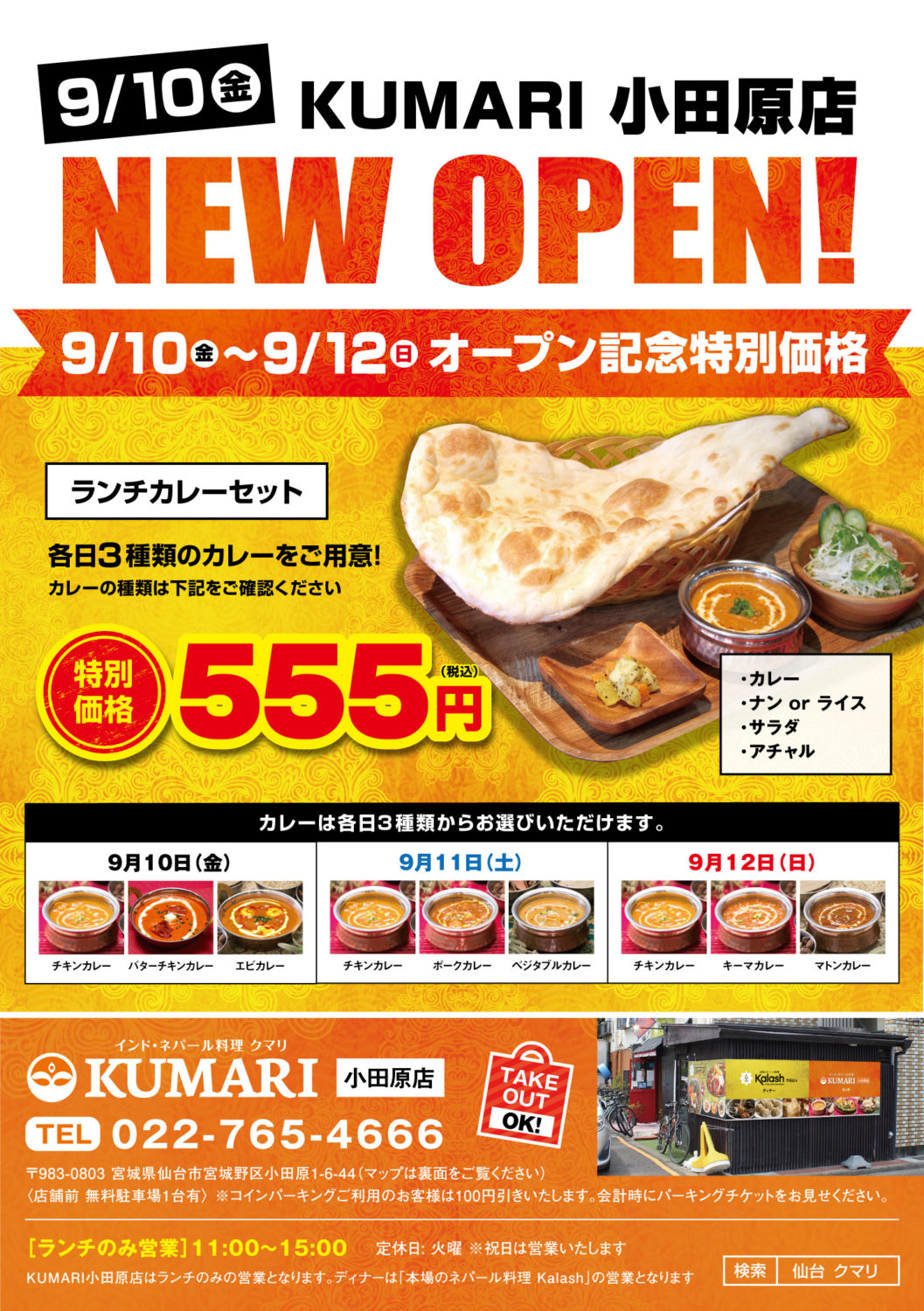 小田原店は元々 KUMARI系列店である『本場ネパール料理 Kalash』の店舗を利用して営業いたします。また他の店舗と違い、ランチタイム限定の営業となり、お昼はKUMARIでインドカレーを、夜はKalashでネパール料理を提供させていただきます。