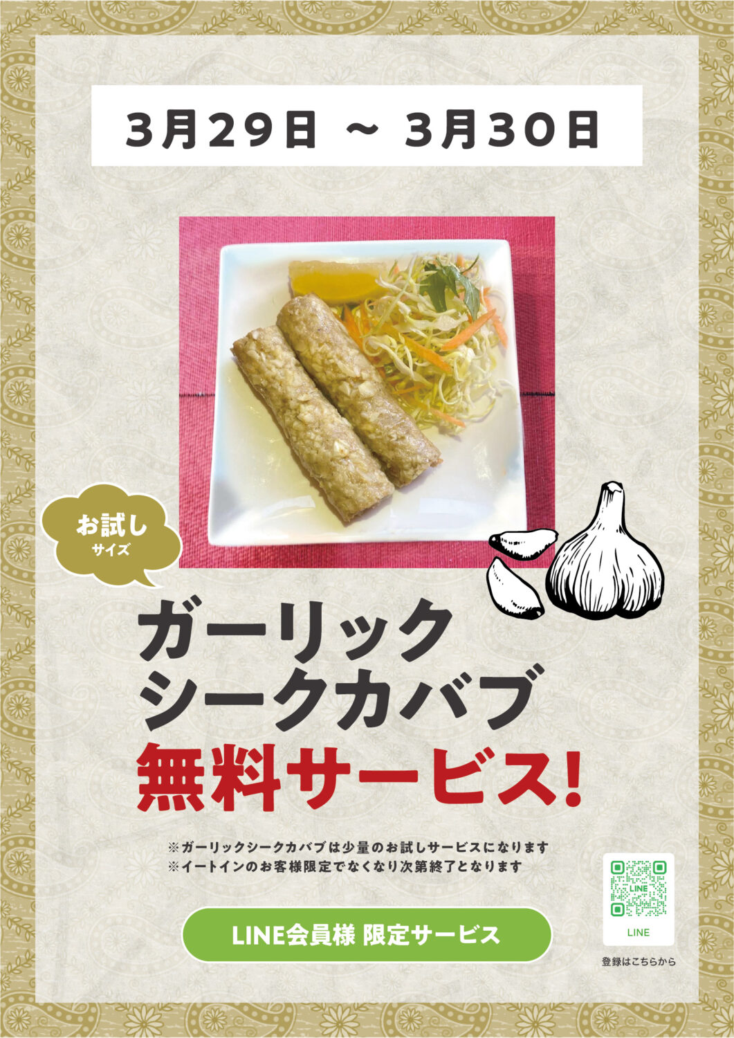 3/29〜3/30お試し無料サービス ガーリックシークカバブ